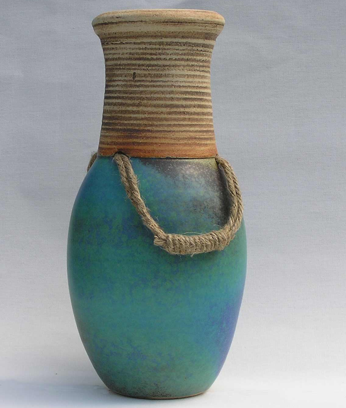 Vom Drehen der Vase auf der Scheibe, über das Abdrehen und Schnitzen bis zur Behandlung mit Eisenoxid, Wachsen, Glasieren und Brennen, benötige ich etwa 1,5 Stunden pro Vase.